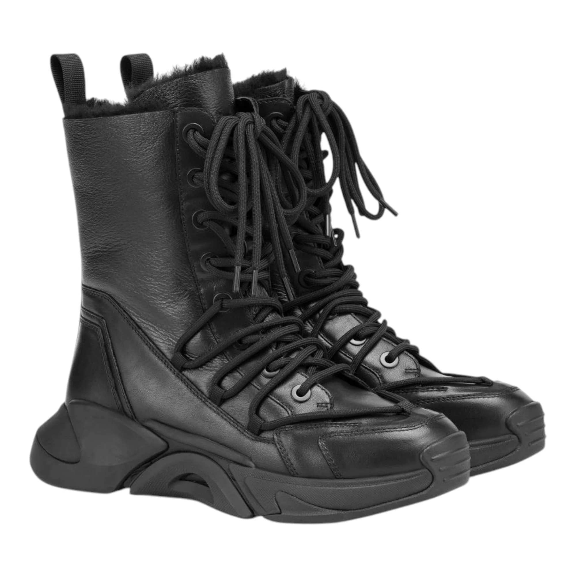 Натуральная кожа верха обеспечивает долговечность и презентабельный внешний вид, а подкладка из натурального меха создает комфортный микроклимат даже в морозные дни. Резиновая подошва высотой 30 мм гарантирует надежное сцепление с любой поверхностью, включая обледенелый асфальт. Платформа добавляет несколько сантиметров роста и визуально удлиняет силуэт.