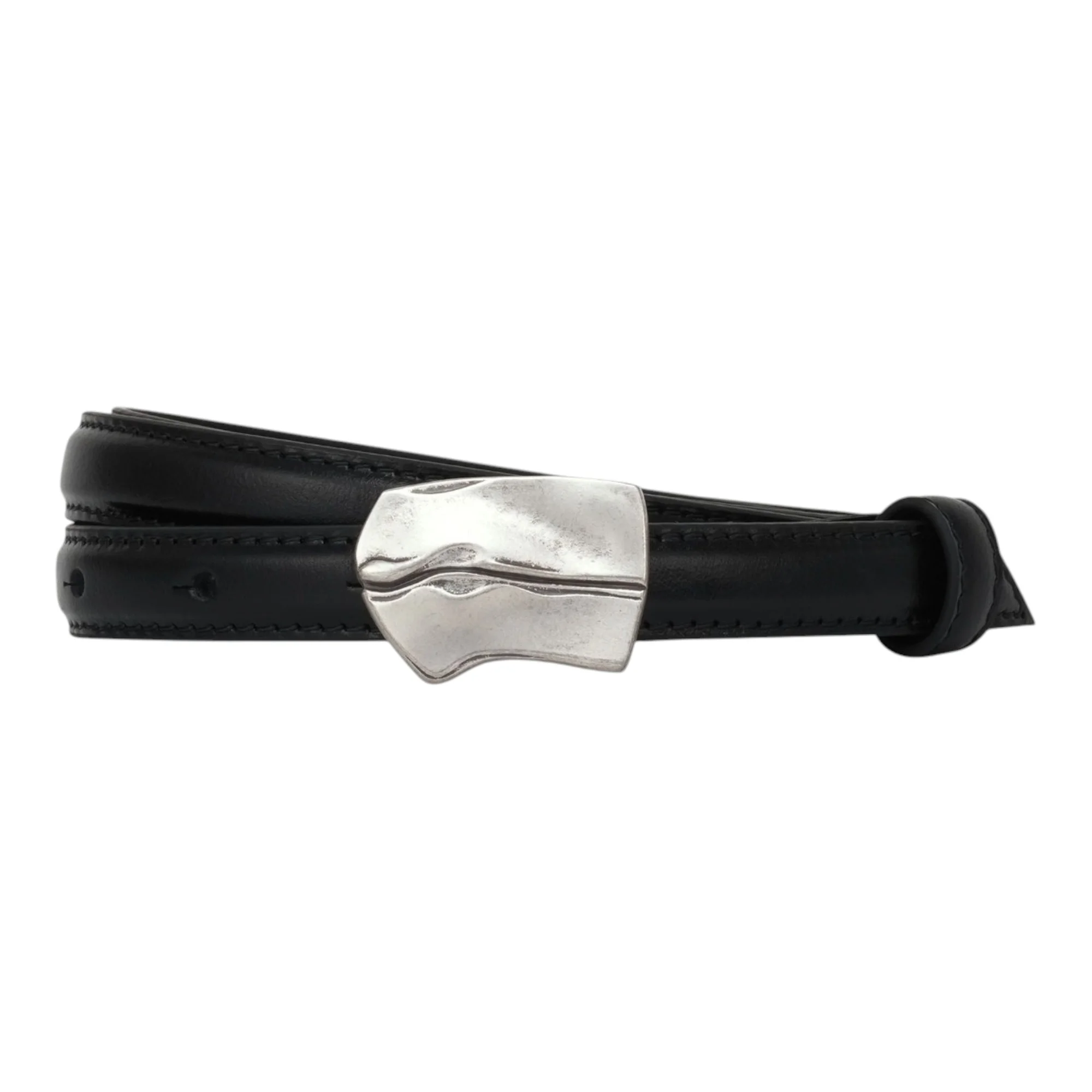 Натуральная кожа обеспечивает долговечность и сохранение формы даже при регулярном использовании. Материал приятен на ощупь и со временем приобретает индивидуальную патину, что делает аксессуар еще более выразительным. Черный цвет позволяет сочетать ремень с одеждой любых оттенков, от нейтральных до ярких акцентных.